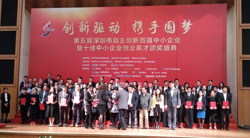 2017年11月23日下午,由深圳市科創委、深圳市中小企業服務署、中國中小企業協會指導,深圳市中小企業發展促進會與深圳特區報社聯合主辦的“創新驅動·攜手圓夢--第五屆深圳市自主創新百強中小企業暨十*中小企業創業英才頒獎盛典”在五洲賓館盛大舉行,日聯科技等百家企業獲得了該榮譽,深圳市委市政府相關領導,企業代表、及社會各界代表出席了本次盛典。