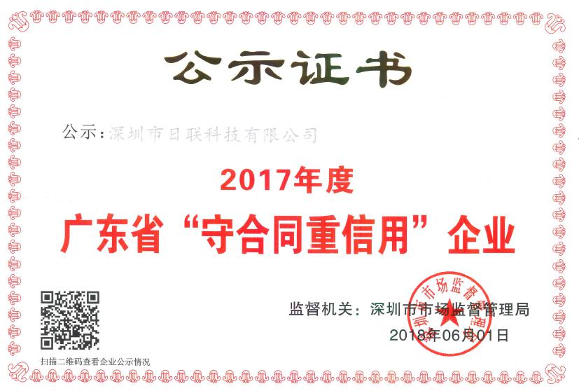 近日,廣東省工商行政管理局發(fā)布關(guān)于2017年度 “廣東省守合同重信用企業(yè)”的公告,日聯(lián)科技憑借十多年來的積累與信譽,再度榮獲“守合同重信用企業(yè)”這一榮譽稱號。