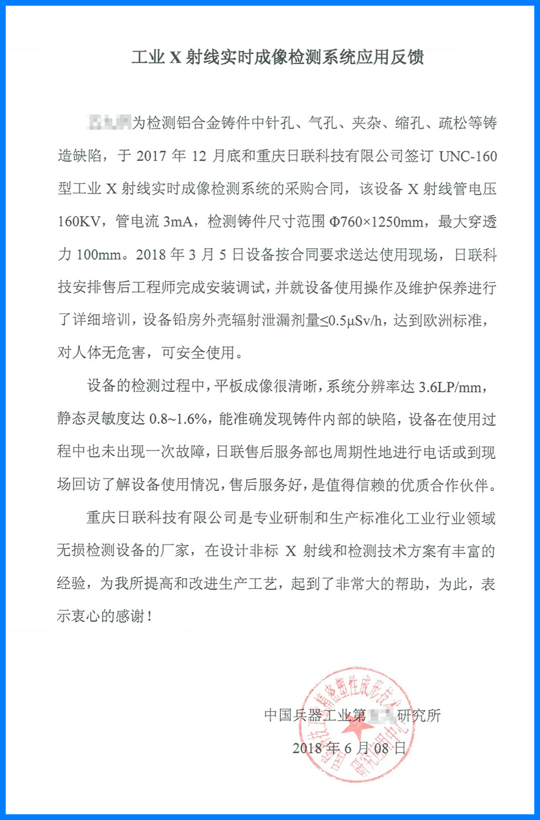 近日,日聯科技收到了中國兵器工業集團反饋的用戶使用報告。在該報告中,中國兵器工業集團對我司設備穩定可靠的工作性能、專業細致的售后服務、完善詳盡的操作培訓給予了高度的認可和評價,并重點指出我們的UNC160工業X射線實時成像檢測設備能準確發現鑄件的內部缺陷,為他們產品質量的提高和生產工業的改進提供了可靠保障,稱贊我們日聯科技為值得信賴的企業合作伙伴。